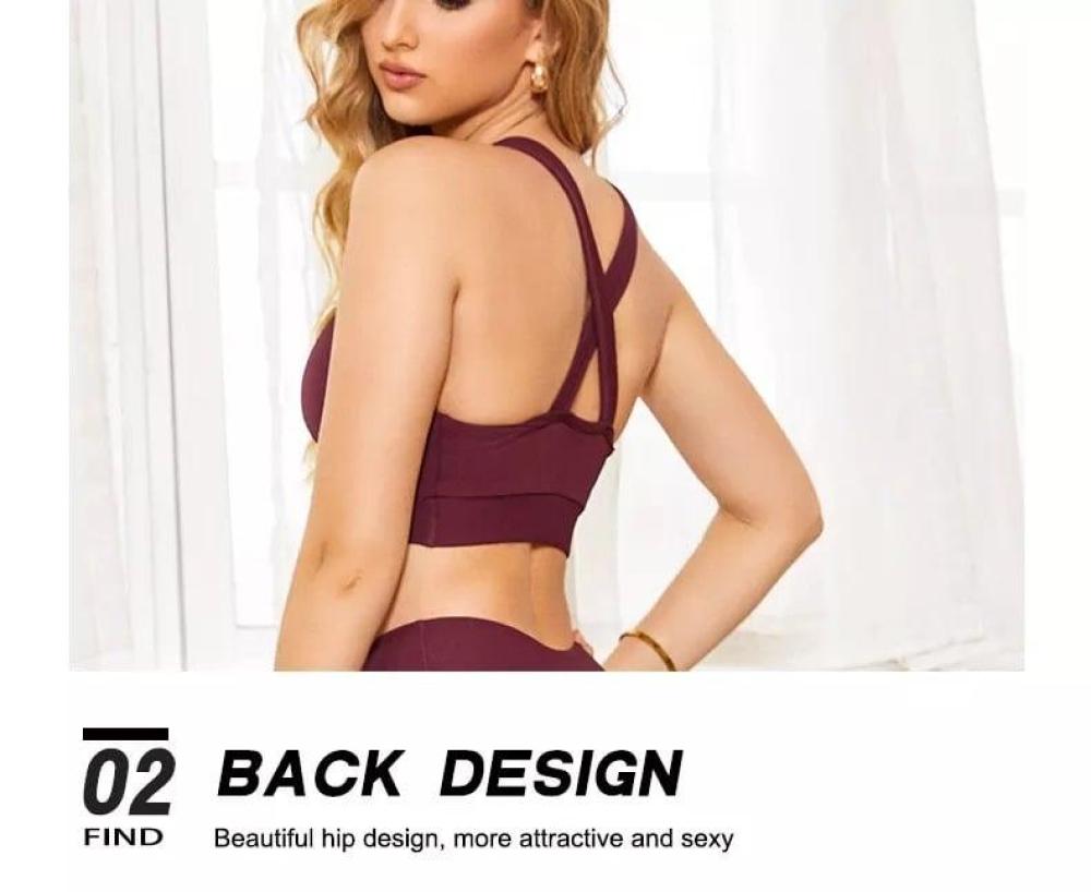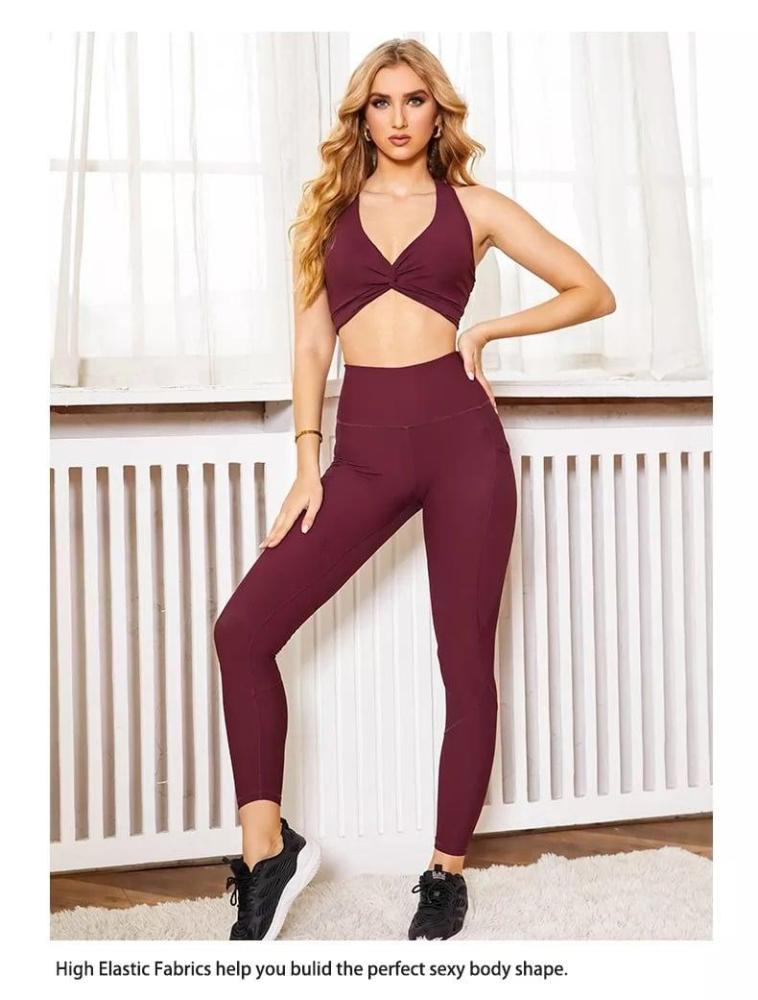 لشعور بالراحة وانسيابية الحركة والمحافظة على جمال إطلالتك اطلبي هذه الملابس الرياضية المصنوعة من أجود الخامات والتي تتميز بتصميم عصري وانثوي جذاب، هذا الطقم مؤلف من حمالة صدر بتصميم متعاكس لتشكل ياقة بشكل حرف V واسعة و حرف X في الجهة الخلفية وذلك لتحصلي على إطلالة مفعمة بالأنوثة والجاذبية، وبنطال بطول الكاحل مزود بخصر مطاطي عريض وجيوب جانبية.