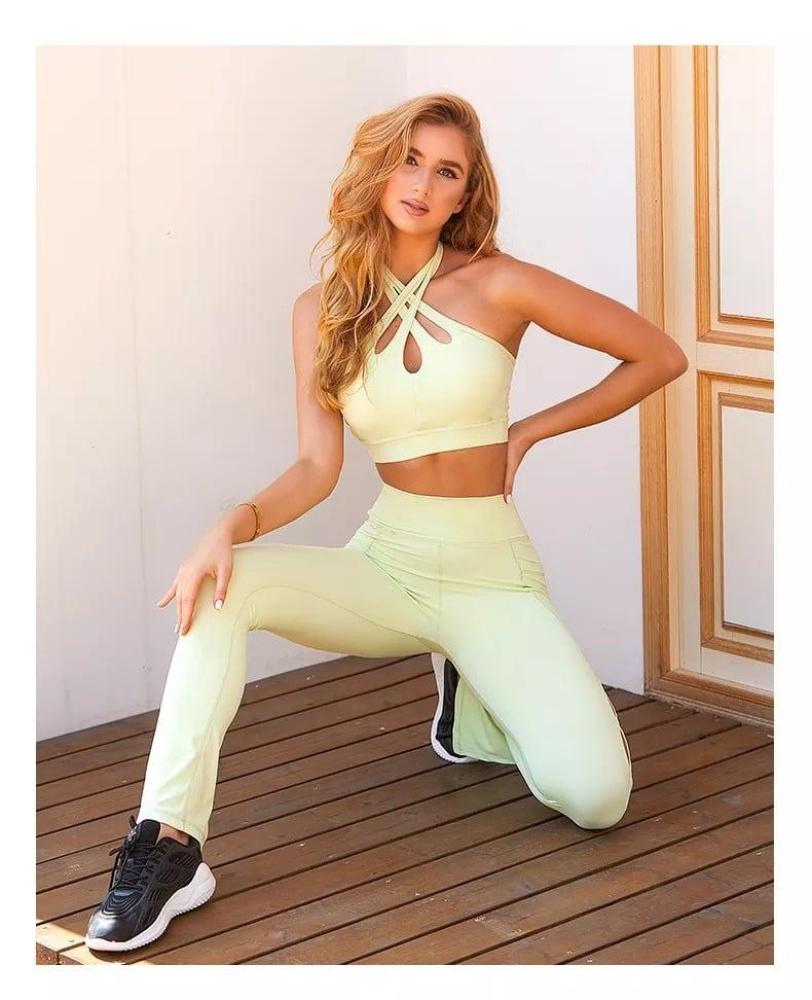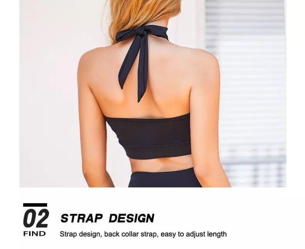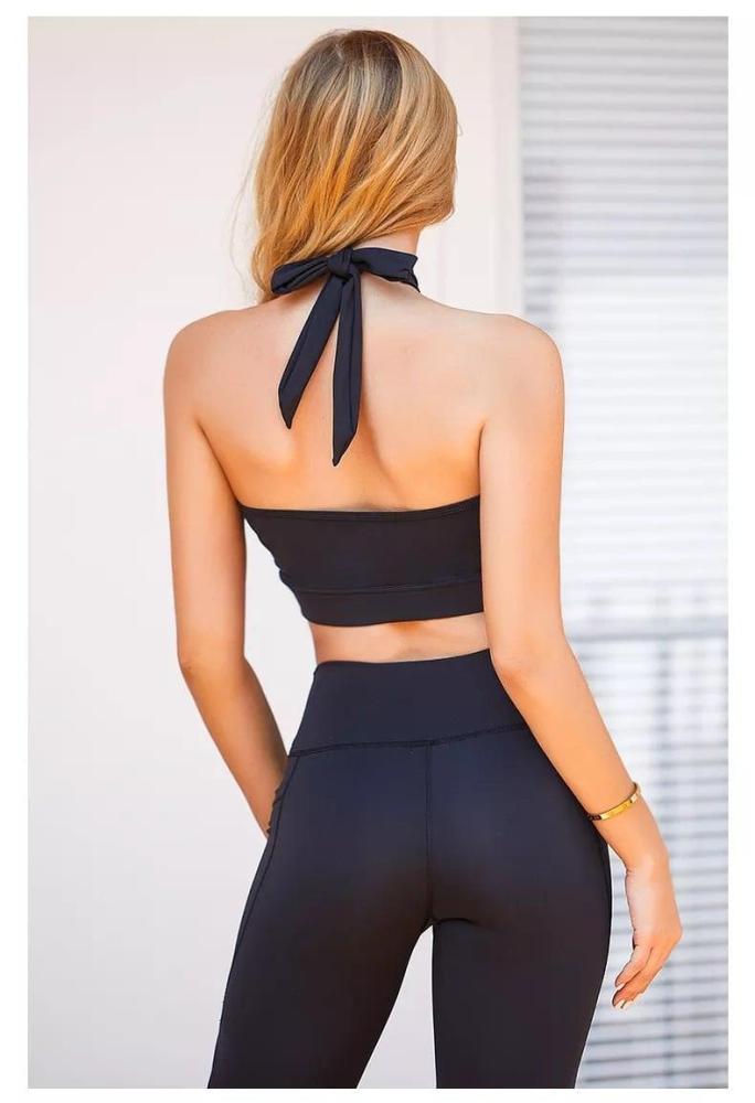 نقدم لك في متجرنا سيدتي مجموعة واسعة من الملابس الرياضية بتصاميم رائعة مواكبة لآخر صيحات الموضة العالمية، ومنها هذا الطقم الرياضي المؤلف من حمالة صدر مزودة بياقة ربط حول الرقبة، وبنطال بطول الكاحل مزود بحزام خصر عريض ومزين بتطريز جانبي بالإضافة إلى فتحات صغيرة جانبية وفتحة ممتدة حتى ربلة الساق، لا تترددي سيدتي في الطلب الآن للحصول على إطلالة انثوية مفعمة بالحيوية.