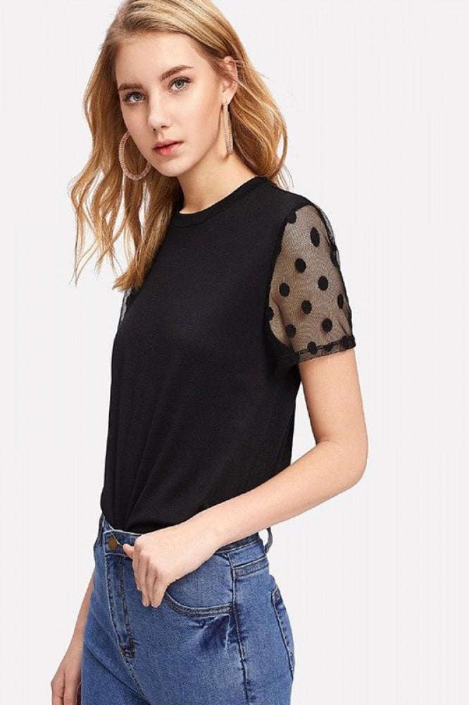 (اللون :الاسود ) ( نوع : تيشيرت ) ( العنق : دائري ) ( الأكمام : قصيرة شبكة )