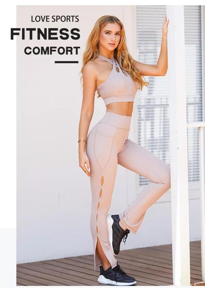 نقدم لك في متجرنا سيدتي مجموعة واسعة من الملابس الرياضية بتصاميم رائعة مواكبة لآخر صيحات الموضة العالمية، ومنها هذا الطقم الرياضي المؤلف من حمالة صدر مزودة بياقة ربط حول الرقبة، وبنطال بطول الكاحل مزود بحزام خصر عريض ومزين بتطريز جانبي بالإضافة إلى فتحات صغيرة جانبية وفتحة ممتدة حتى ربلة الساق، لا تترددي سيدتي في الطلب الآن للحصول على إطلالة انثوية مفعمة بالحيوية.