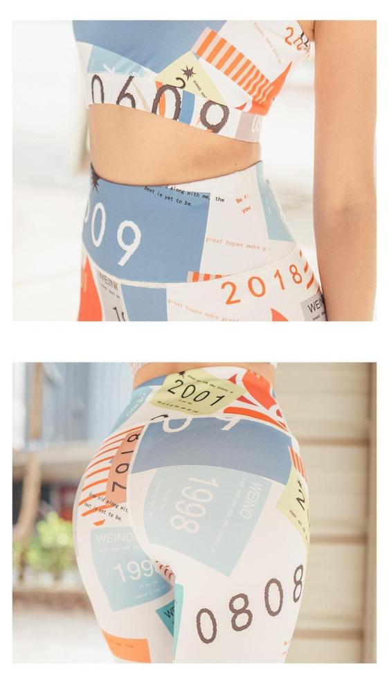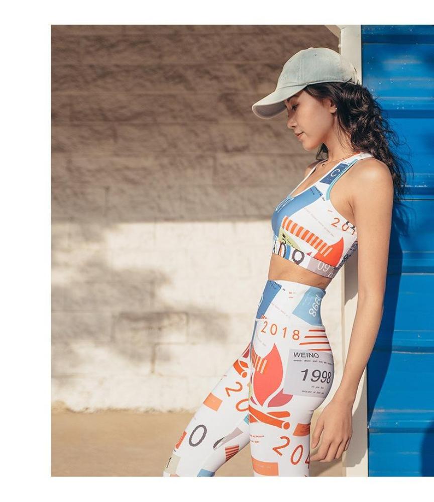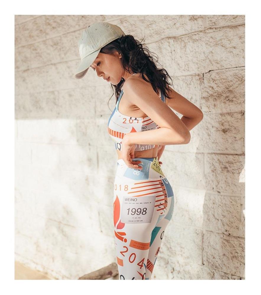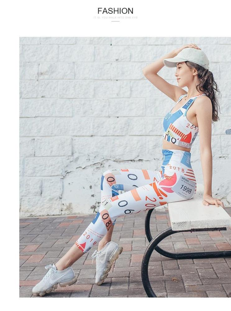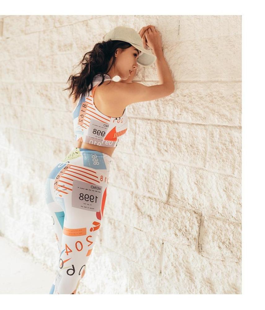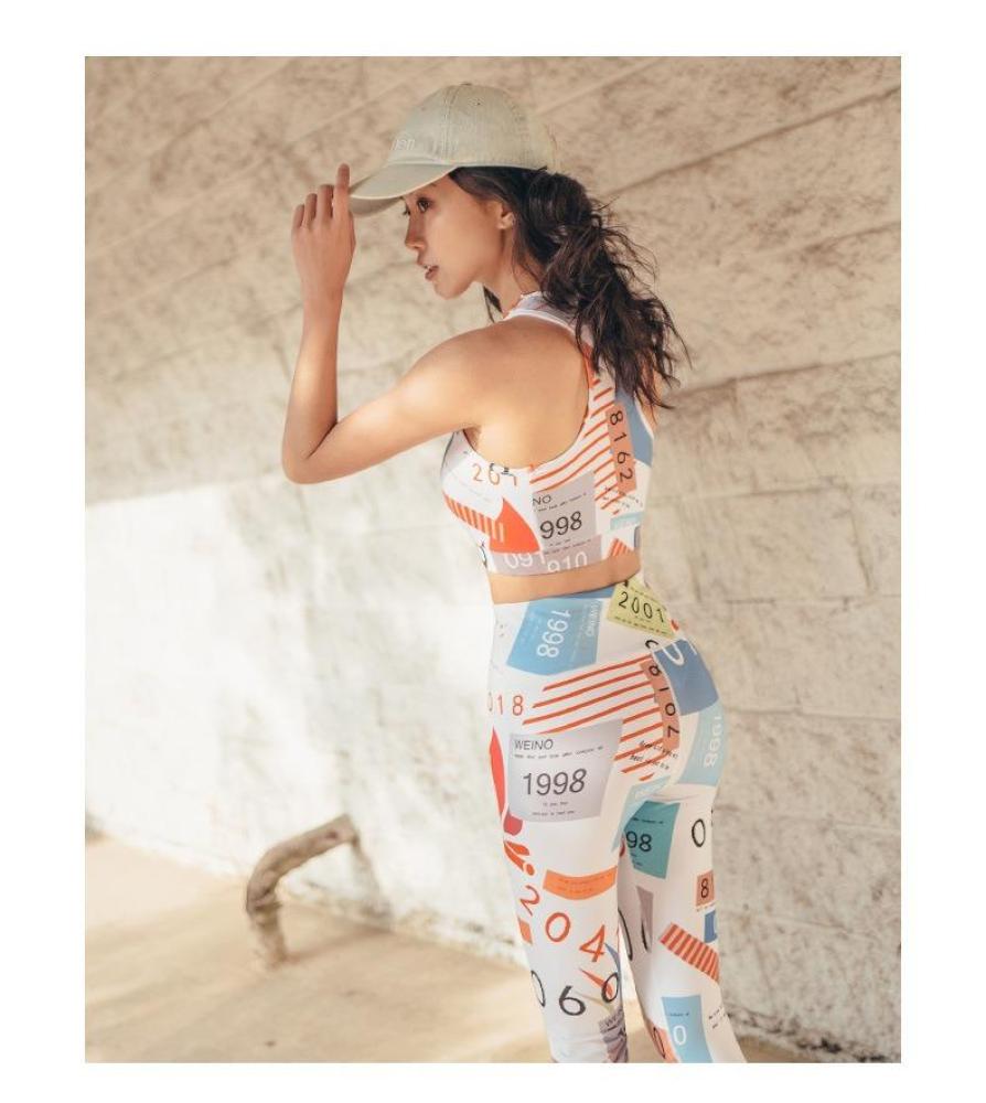 احصلي على إطلالة عصرية تخطف الأنظار مع هذه الملابس الرياضية المزينة بتصميم مطبوع بألوان متباينة لإضافة لمسة من التميز والعصرية للتصميم والمصنوعة من أجود الخامات لتحصلي على أعلى مستوى من الراحة أثناء ممارسة التمارين الرياضية، يتألف هذا الطقم الرياضي من حمالة صدر وبنطال بطول الكاحل مصمم بخصر عالي ومزود بحزام خصر عريض.