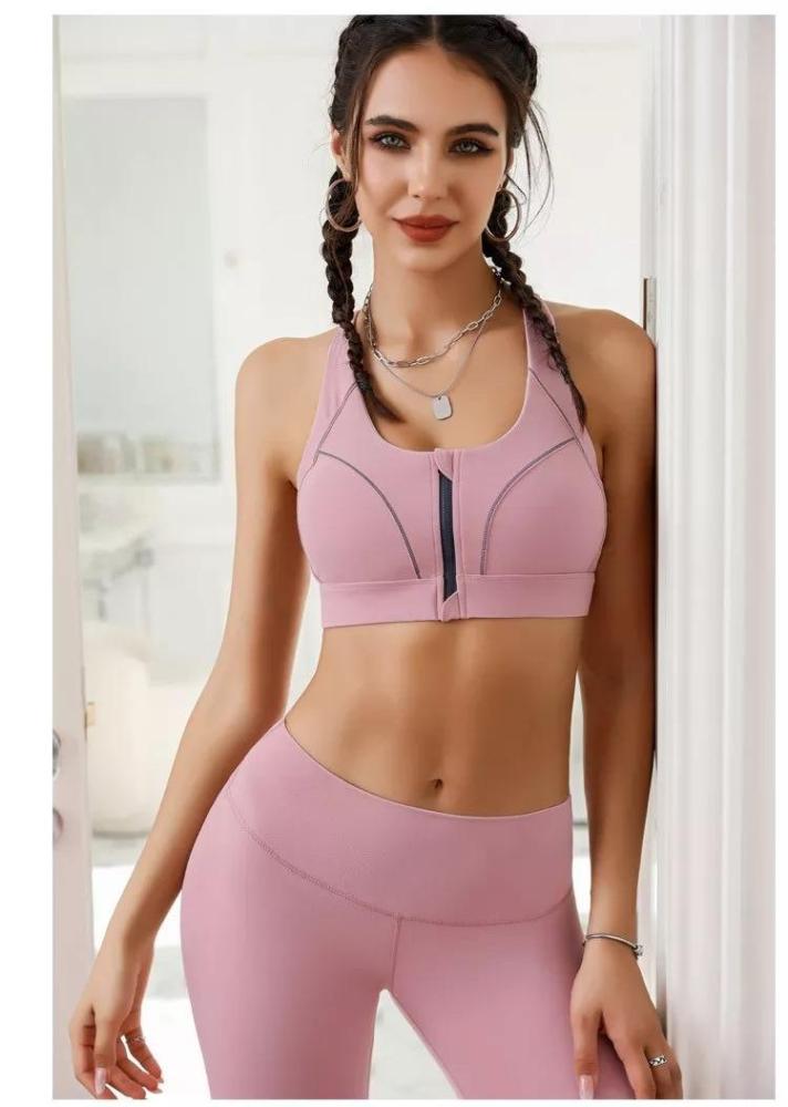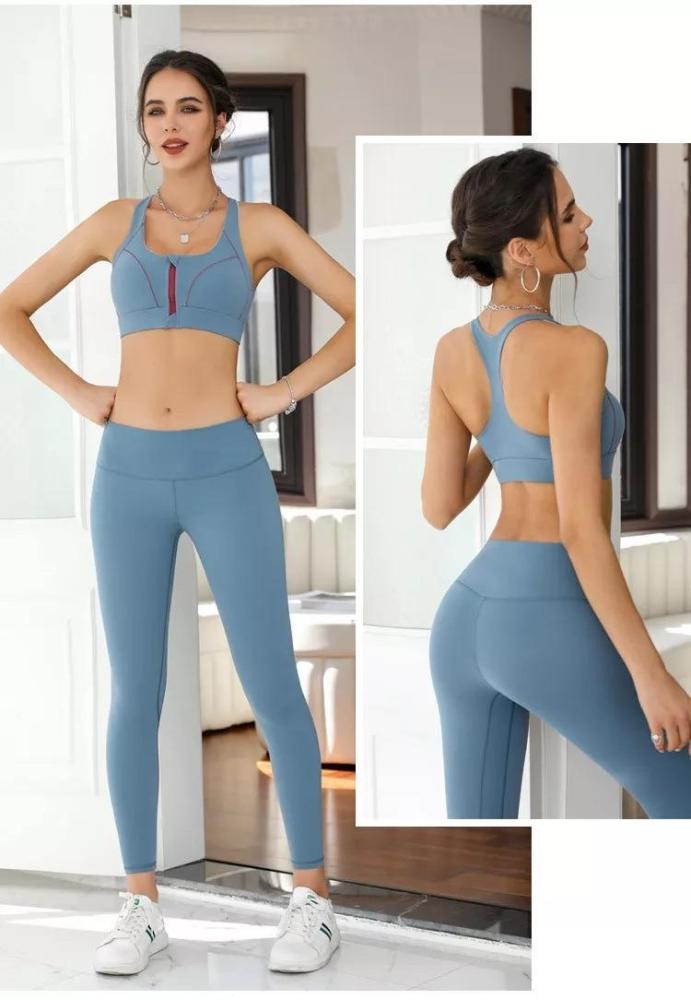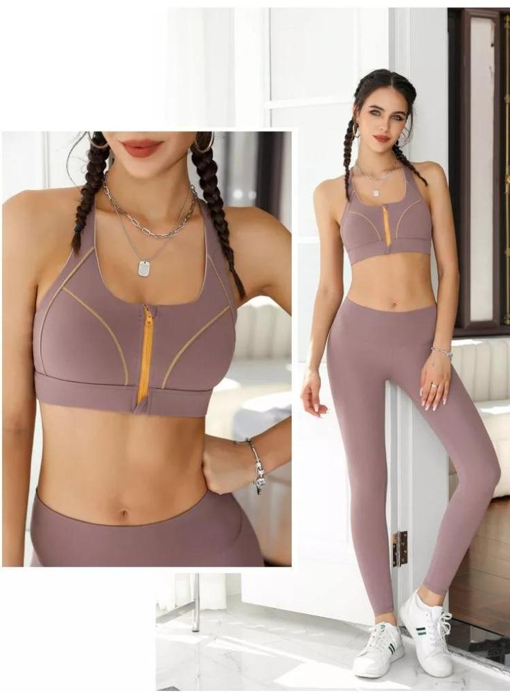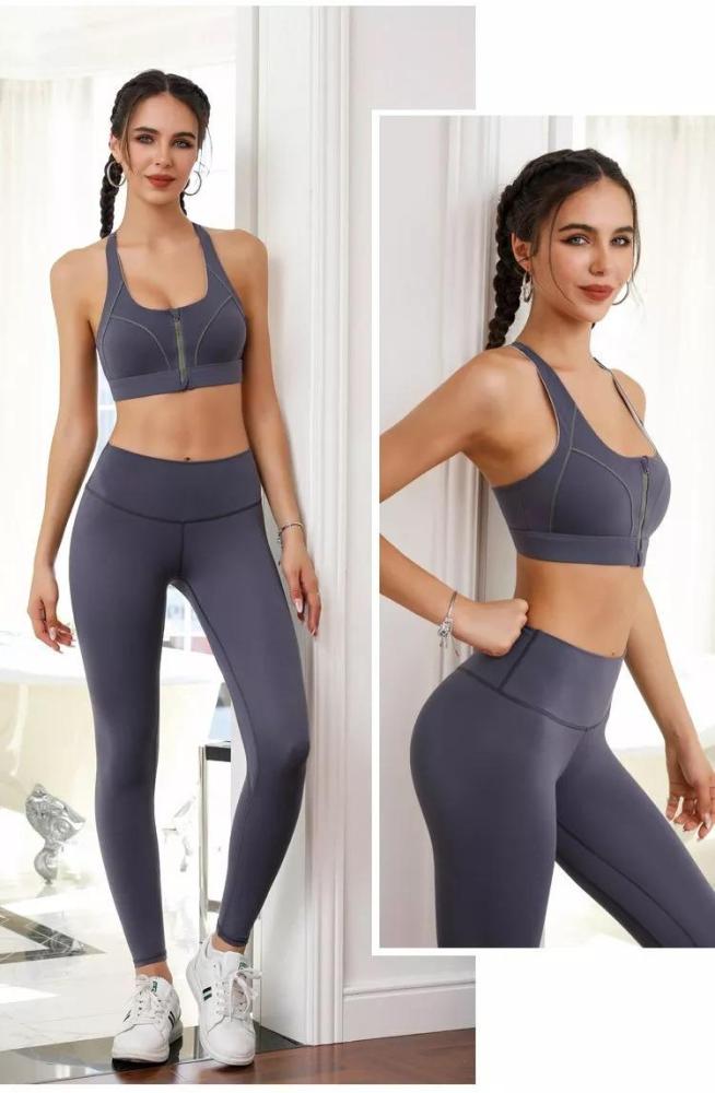 احصلي على إطلالة انثوية جذابة تخطف الأنظار مع هذه الملابس الرياضية المصنوعة من أجود الخامات بتصميم بقصة ضيقة، مؤلف من حمالة صدر بوش أب مزودة بسحاب إغلاق في الجهة الأمامية، الجهة الخلفية من الحمالة مصممة بشكل حرف X، وبنطال بطول الكاحل مزود بحزام خصر واسع، هذه الملابس مناسبة للارتداء يومياً عند ممارسة التمارين الرياضية لما تقدمه من شعور بالراحة أثناء التمرين.