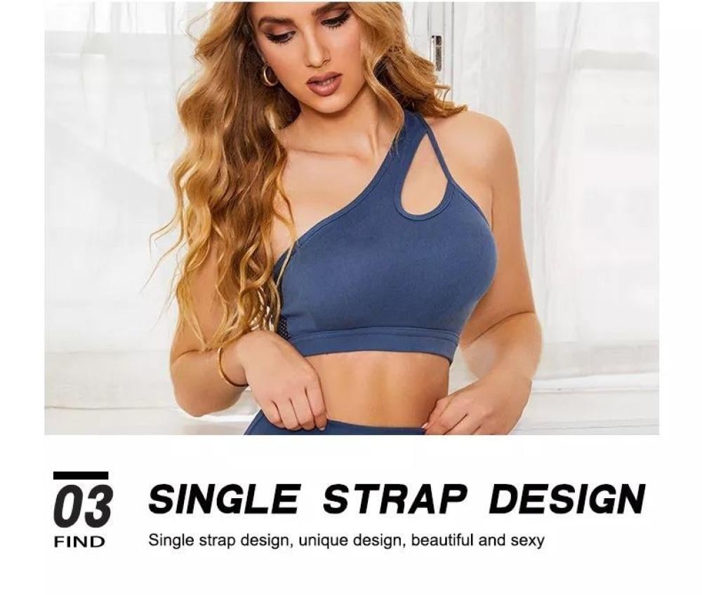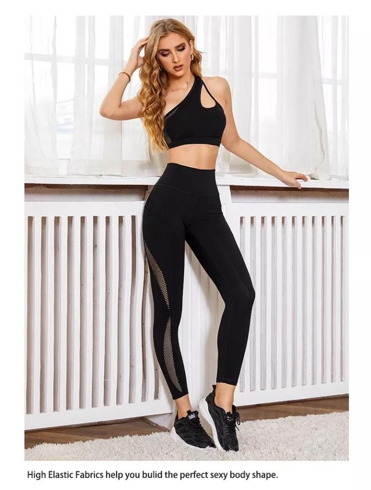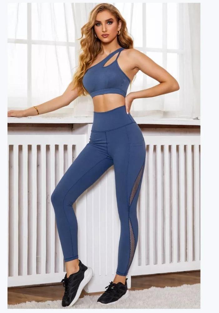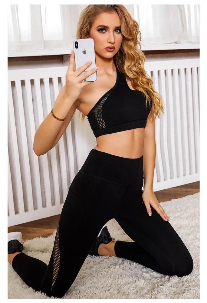 نقدم لك سيدتي هذا الطقم الرياضي الذي يعتبر من أجمل التصاميم وأكثرها طلباً نظراً للتصميم الانثوي الجذاب الذي يتميز به، هذا الطقم مؤلف من حمالة صدر مزودة بحمالة كتف واحدة لإضافة لمسة من الرقة والجاذبية للتصميم، وبنطال بطول الكاحل مزود بحزام خصر مطاطي عريض، يتميز تصميم الحمالة والبنطال بوجود تفاصيل شبكية على الجوانب بأشكال هندسية انسيابية لمزيد من التميز والأناقة.